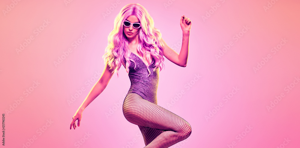 Disco Party Doll girl with pink neon hairstyle dance. High Fashion. Young Gorgeous woman in Colorful uv Light. Music vibes. Pop Art fashionable Style. Night Club, dancing neon concept