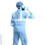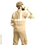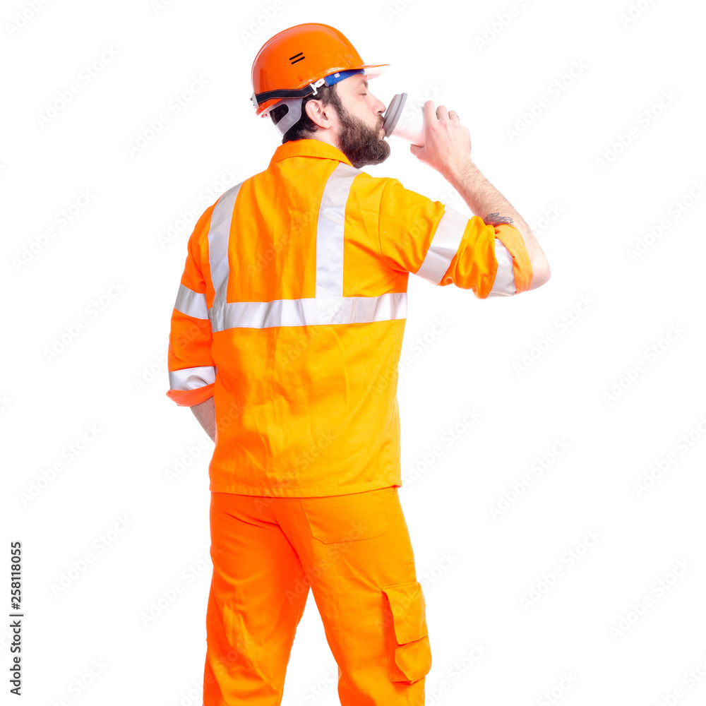 Man worker road constructor relax, drink cup of coffee on white background isolation, back view