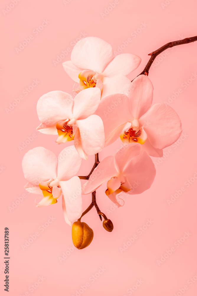 blooming twig of trendy color living coral orchid, phalaenopsis on living coral background