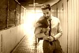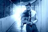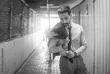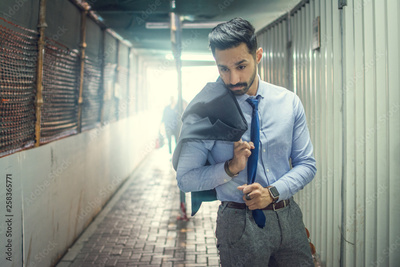 Portrait of handsome businessman in formalwear standing in under construction area walkway tunnel.