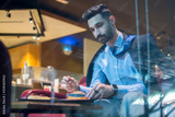 Low angle view of handsome young business man having a lunch during office break in nearby cafe