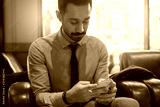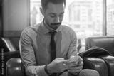 Close up portrait of young business man using mobile phone while sitting in comfortable chair indoors