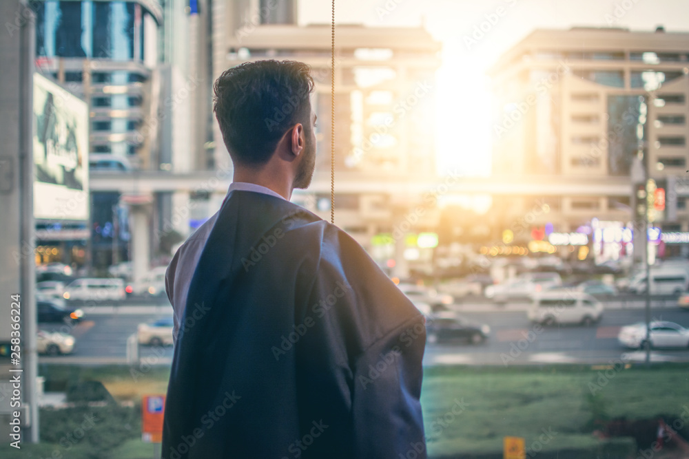 Back view of businessman with suit jacket around shoulders looking at city skyline during sunset.