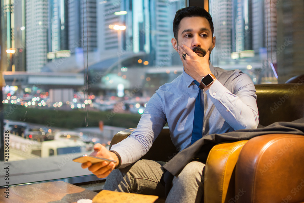 Handsome businessman covering with hand his pensive face while sitting in comfortable chair and holding smart phone. Business, director, modern lifestyle concept.