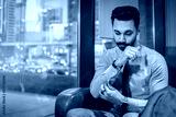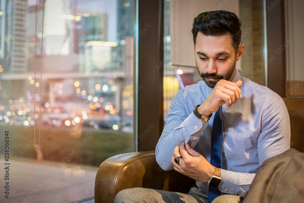 Businessman fastening buttons on shirt sleeve while sitting in office