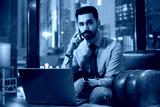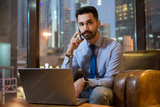 Young business man with laptop talking on mobile phone in modern office