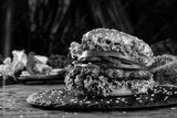 Beef burger with tomatoes, red onions, cucumber and lettuce on black slate over dark background. Unhealthy food