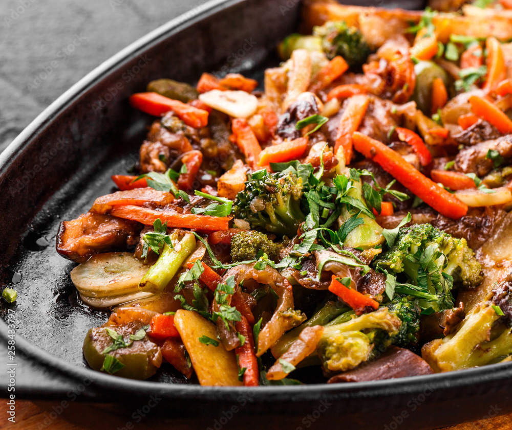 Baked vegetables, greens, potatoes, broccoli in pan on black stone background. Clean eating, healthy vegan food concept. Top view, flat lay