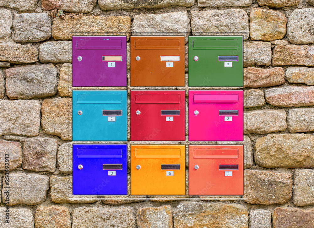 Boîtes aux lettres couleurs incrustées dans mur de pierres