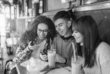 Three smiling multicultural classmates sitting at coffee shop, drinking coffee and looking at smart phone. On desk notebooks, markers and pens.