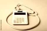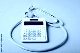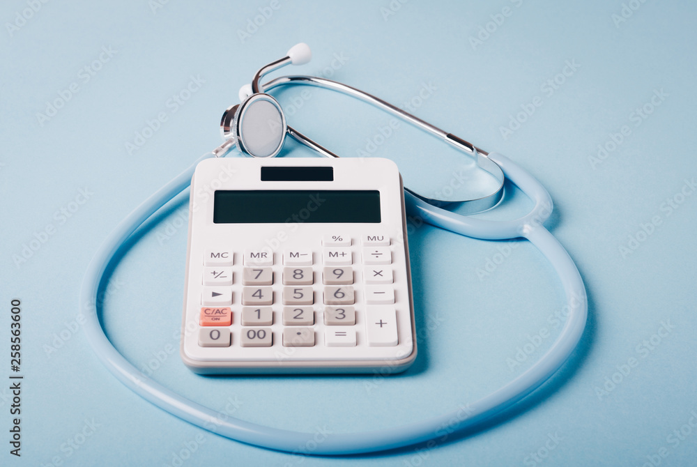 White calculator and blue stethoscope on a blue background as a symbol of paid (expensive) medicine