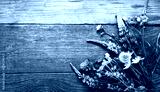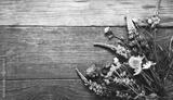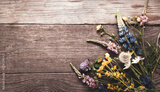 Wild flowers on old grunge wooden background (chamomile lupine dandelions thyme mint bells rape)