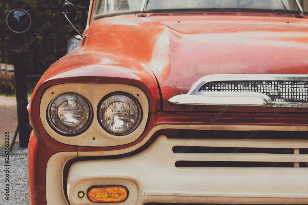 Headlight lamp of vintage car - vehicles classic style. retro film color filter effect.