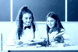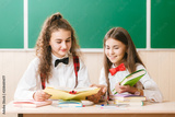 two beautiful schoolgirls are sitting at the desk with books in the classroom