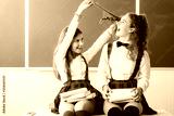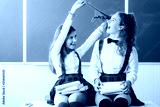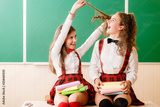 two pretty schoolgirls in school uniform stand with books in the classroom against the background of the blackboard