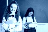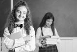two pretty schoolgirls in school uniform stand with books in the classroom against the background of the blackboard