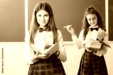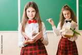 two pretty schoolgirls in school uniform stand with books in the classroom against the background of the blackboard