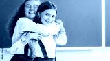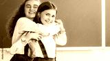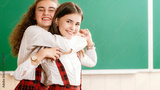 two pretty schoolgirls in school uniform stand with books in the classroom against the background of the blackboard