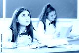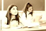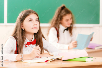 two beautiful schoolgirls are sitting at the desk with books in the classroom