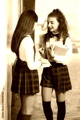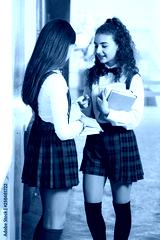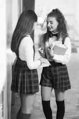 two pretty schoolgirls in school uniform stand with books
