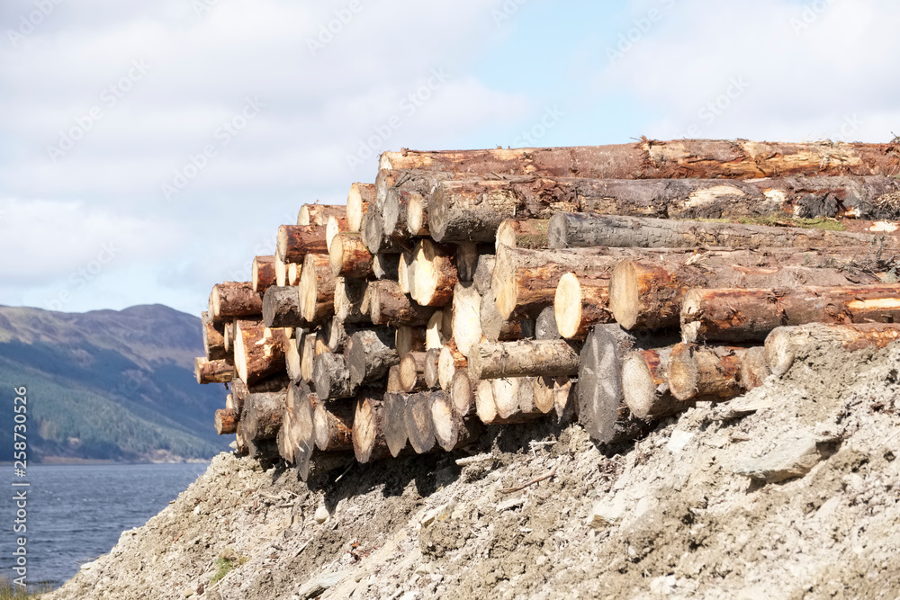 Chopped wood logs stack for fire place at home on forest woodlands green biomass energy