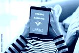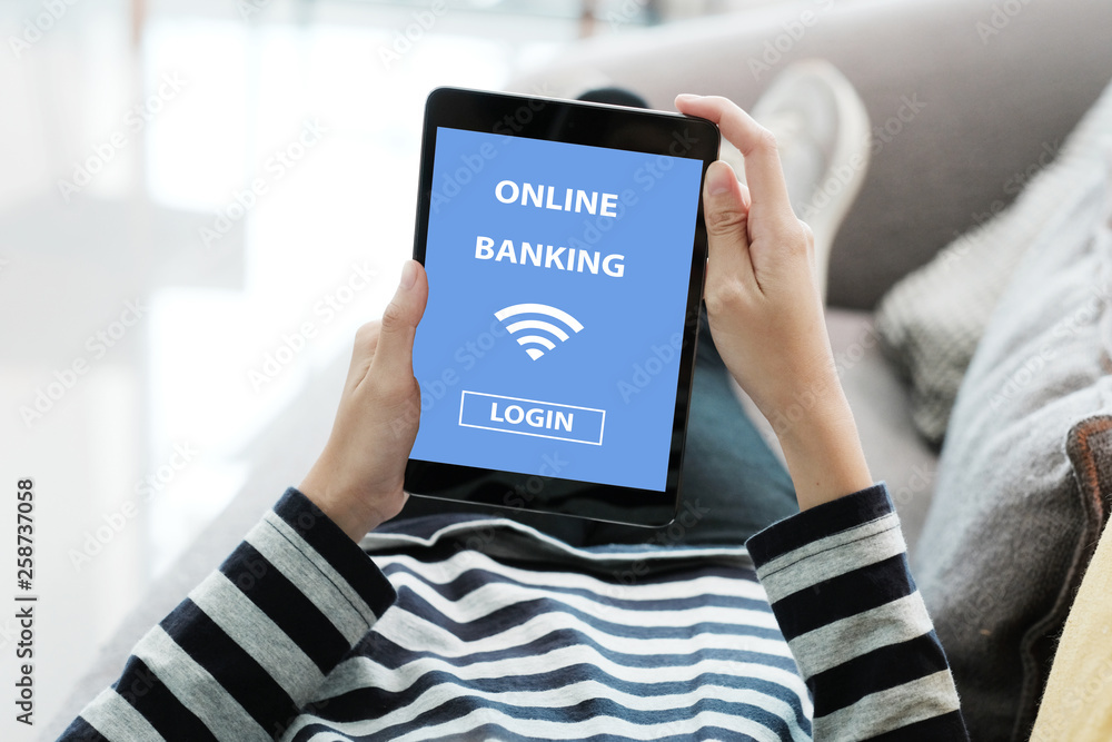 Hand using digital tablet with online bank account password login on screen over blur background, online banking cyber security concept
