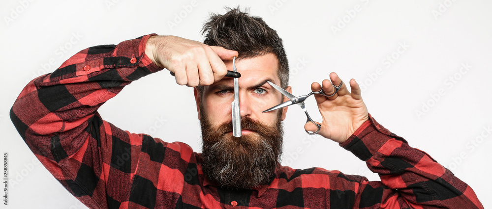 Barber scissors and straight razor, barbershop. Mens haircut, shaving. Bearded man, long beard, brutal, caucasian hipster with moustache. Vintage barbershop.