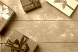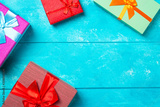 Colorful gift boxes with ribbons on nice blue wooden background. Copy space. Christmas or birthday celebration holiday theme.