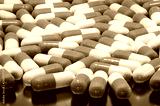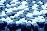 Blue-white antibiotic capsule pill spread on stainless steel drug tray. Global healthcare concept. Antibiotics drug resistance. Antimicrobial capsule pills. Pharmaceutical industry. Capsule texture.