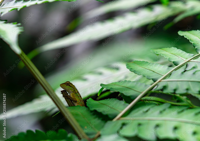 Oriental garden lizard, Eastern garden lizard, Changeable lizard (Calotes mystaceus) in the forest. Reptiles animal. Green and brown lizard. Chameleon on the branches in the forest. Animal wild life.