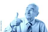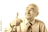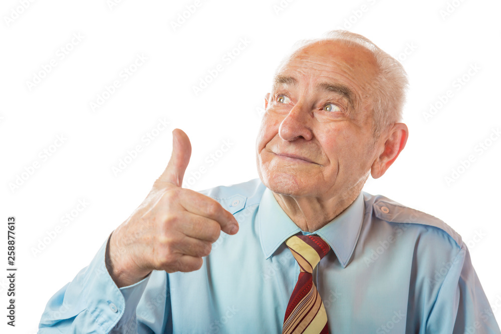 Portrait of handsome european senior old man showing thumbs up gesture isolated on white background. Free space