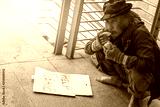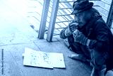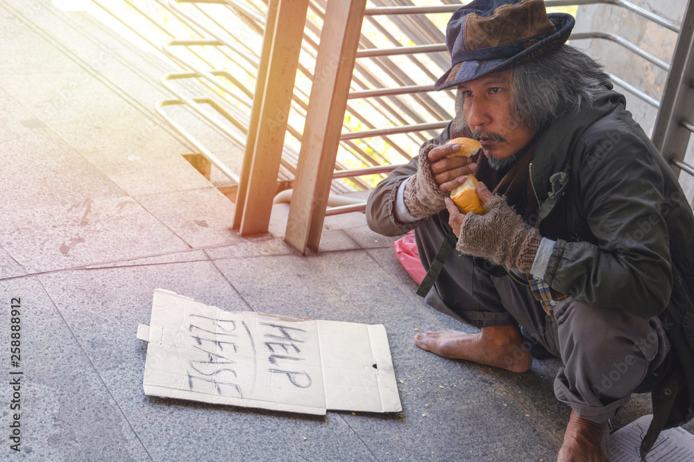 Homeless man is sitting down on walkway in town. He Eating bread.He is very glad and happy. poverty, despair, Photo Sympathetic and hope concept.