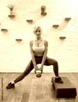 Attractive sportswoman working out with kettlebell on fitness stepper against white brick wall