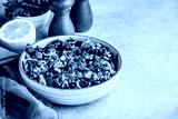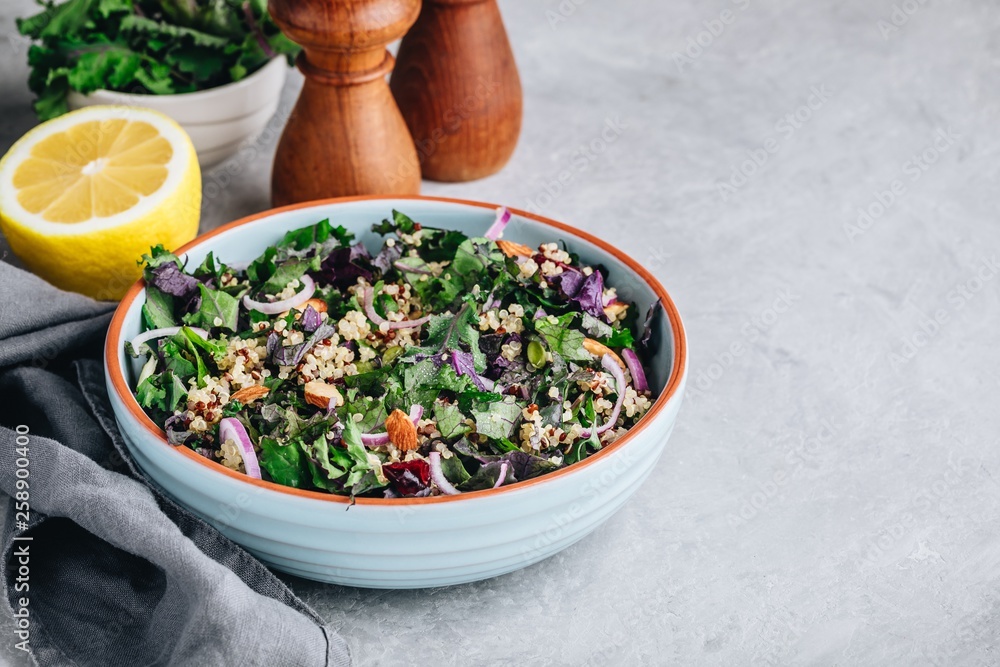 Healthy bowl kale and quinoa salad with cranberry, red onions and almonds