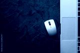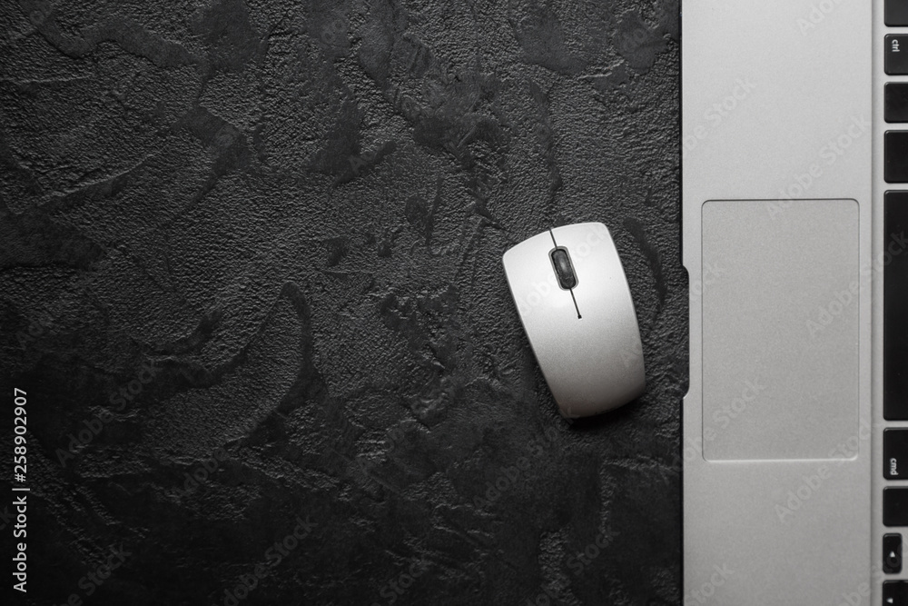 Modern silver laptop with a mouse on dark background. Top view and copy space.