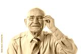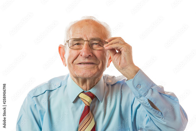 Portrait of happy 90 year old senior man holding glasses, smiling and looking at camera isolated on white background.