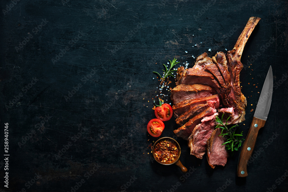 Grilled dry aged tomahawk steak sliced as close-up