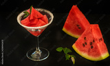 Slices of watermelon on a on black background and in a glass goblet,