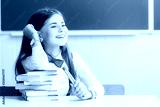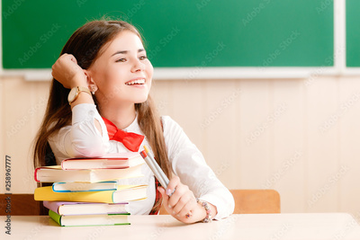 girl in school uniform sitting at her desk in the classroom with books. Student in class at school