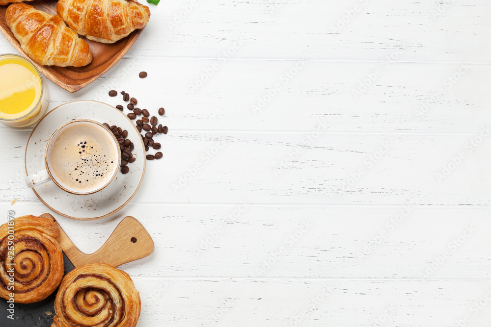 Coffee, juice and croissants breakfast