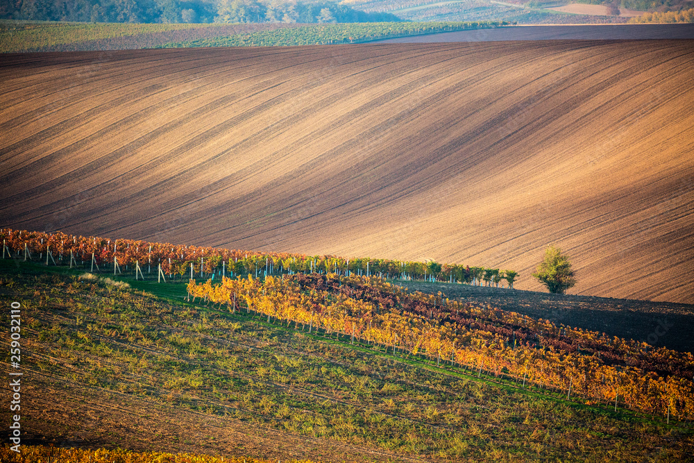 A lonely autumn tree against the background of the moravian fields and lines of autumn vineyards. Amazing autumn landscape of the Czech Tuscany South Moravia. Nature seasonal landscape.