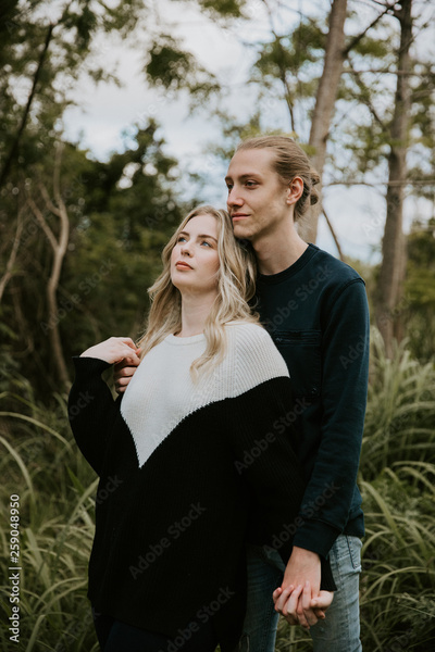 Cute Young Attractive Dating Couple Looking, Smiling, and Laughing in the Dense Isolated Green Tropical Forest Jungle