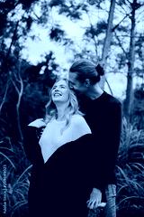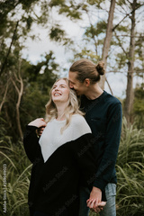 Cute Young Attractive Dating Couple Looking, Smiling, and Laughing in the Dense Isolated Green Tropical Forest Jungle