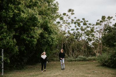Cute Young Attractive Dating Couple Looking, Smiling, and Laughing in the Dense Isolated Green Tropical Forest Jungle