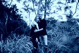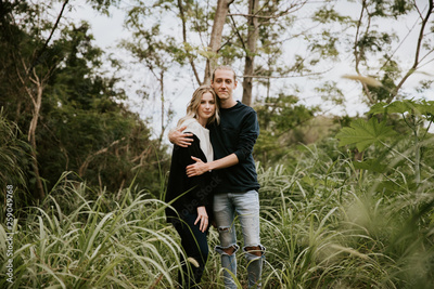 Cute Young Attractive Dating Couple Looking, Smiling, and Laughing in the Dense Isolated Green Tropical Forest Jungle