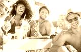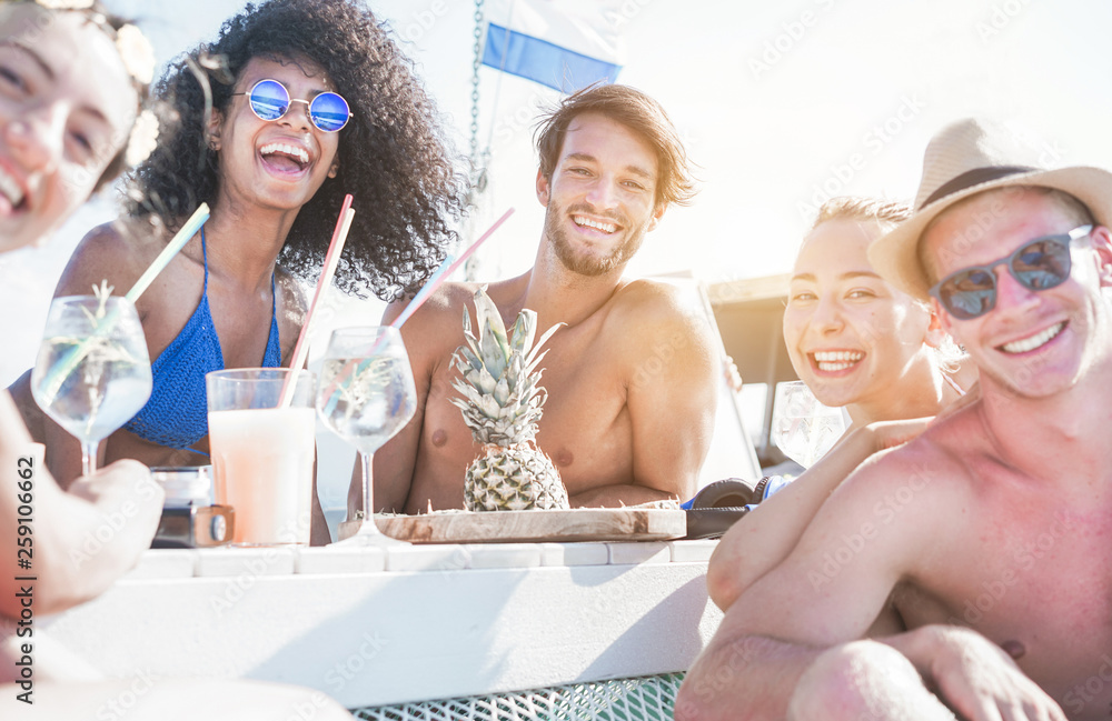 Happy friends drinking tropical cocktails at boat party