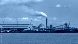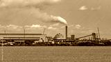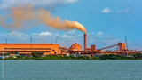 A chimney emits smoke at a bauxite industrial complex on the coast at Guinea, West Africa.