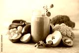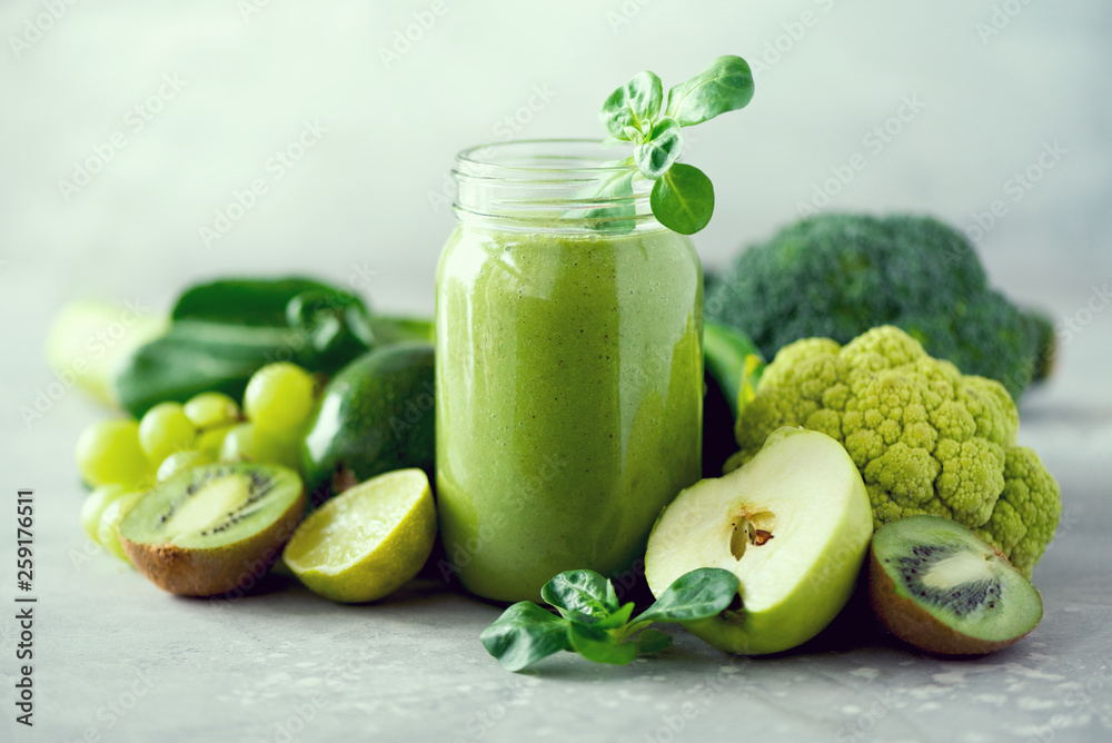 Glass jar mugs with green health smoothie, kale leaves, lime, apple, kiwi, grapes, banana, avocado, lettuce. Copy space. Raw, vegan, vegetarian, alkaline food concept. Banner