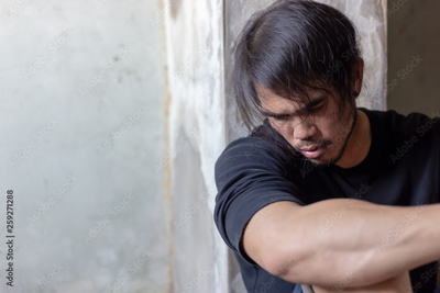 Poor guy looks sad, depressed and hopeless. Handsome man or worker gets jobless. He gets bankrupt because of economy crisis that make him losses everything. Attractive asian men get boring copy space