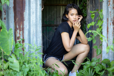 Portrait charming beautiful asian woman. Attractive beautiful young girl has beautiful face. Gorgeous woman has a lot of confident. Asia woman sits at abandoned house. Glamour woman looks at camera